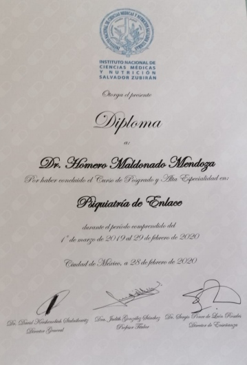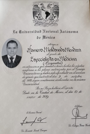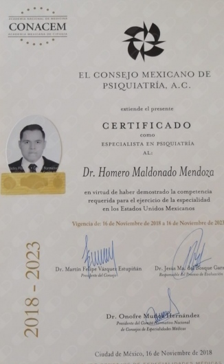 Hola, mi nombre es Homero Maldonado. Soy médico cirujano con especialidad en Psiquiatría por el Hospital "Fray Bernardino Álvarez" y alta especialidad en Psiquiatría de Enlace por el Instituto Nacional de Ciencias Médicas y Nutrición "Salvador Zubirán". Tengo experiencia en el ámbito público y privado, incluyendo mi labor como médico adscrito en el Hospital General de México.
